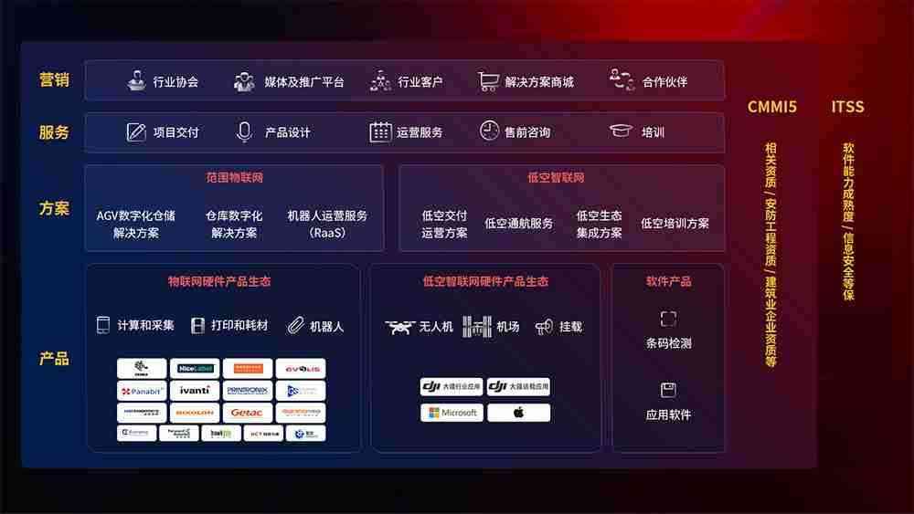 聚合国内外先进的物联网硬件产品品牌,,,聚焦数字化仓储、、、、机器人运营、、、、低空智联网等领域,,,共同打造适合客户业务场景的解决方案并提供交付服务
